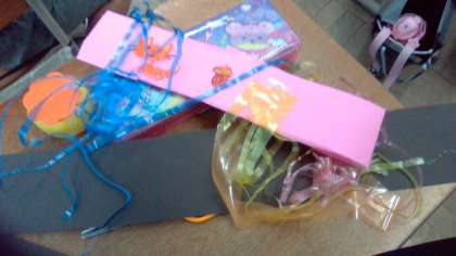 今日の図工の時間に,画用紙でわっかを作り,そのわっかに飾りをつけていろんなものに変身しました。
