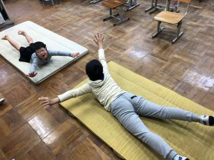 写真は,「正義のヒーロー」ポーズです。手と足を伸ばして浮かし,体を鍛えています。