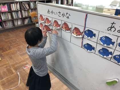 子どもたちは釣った魚をマスに入れ,数を数えてからそれぞれのプリント学習をしています。プリントには釣った魚の数やどちらが多いかを書いています。