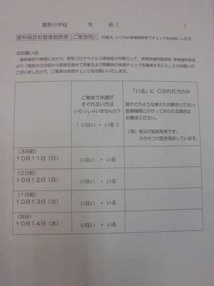 歯科検診実施にあたり,先週配布しました以下のプリントを明日お子様に持たせてください。