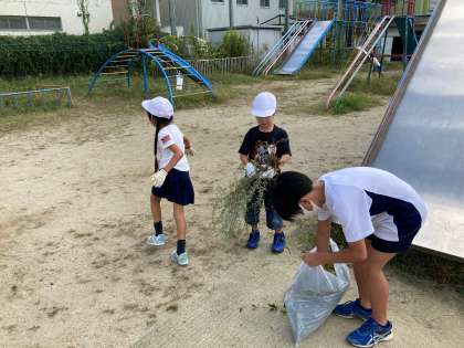 1年生と6年生が一生懸命に草を抜いてくれたので,袋はあっという間に満タンに。