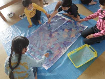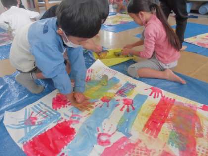 約束ごとを確認していざ図工室へ。班に分かれてぺったんコロコロ,ぺったんコロコロ。いろんな形を楽しみながらたくさんぺったんコロコロしました。
