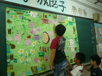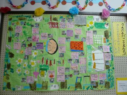 生活科の学習で三反田公園マップを作りました。まず,三反田公園には何があるか,どんないいところがあるかみんなで調査をしました。その後,教室に戻ってマップ作り。「入口が5こあったよ」「ひとつめおばけみたいな木を見つけたよ」「とんぼがとんでたよ」「かいがら21こもみつけたよ」と,みんなのおすすめポイントも載った1枚の地図が完成!!出来上がったときは,わーっとみんなで拍手!教室にかざってあります。
