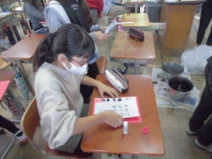 文字の配列と大きさ,点画のつながりに気をつけて,秋の俳句を小筆を使って書きました。