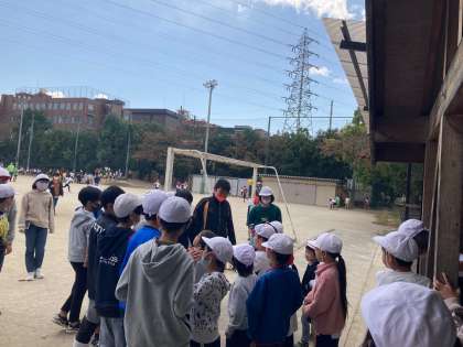 1年生と6年生が一緒になって,運動場を元気に走り回っていました。
