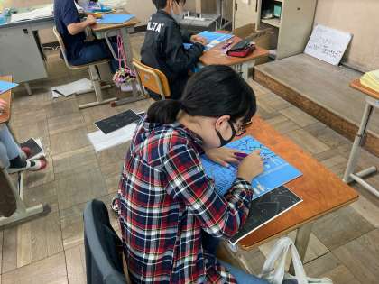 下描きした絵を板に写し,彫刻刀を使って彫る作業がスタートしました。