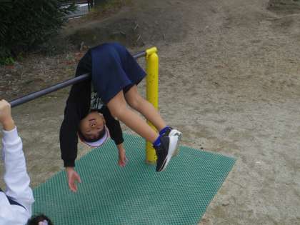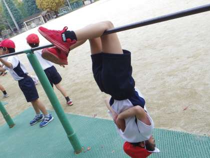 鉄棒に足をひっかけて,ぶら下がる「こうもり」