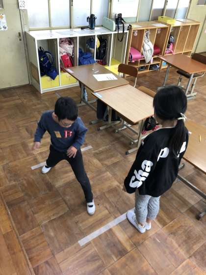 子どもたちは大股で「1m,2m・・・」と数えながら,教室の端から端まで移動していました。