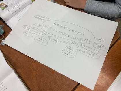 今日は,自分達でテーマを考え,それについて話し合いを行いました。話を回す人は,自分の意見を伝えながら,多くの人が意見を言ったり,質問をしたりすることができるように工夫していました。(2枚目の写真は話し合いの内容をまとめているもの)