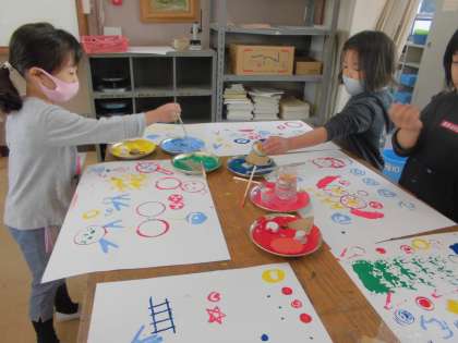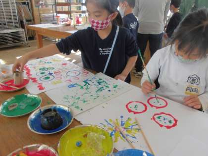 図画工作「うつした かたちから」の学習では,お家から持ってきていただいたものを使って画用紙にペタペタと色をつけていきました。ただおしていくだけでなく,わりばしやつまようじなどを使って模様をつけて可愛く仕上がりました!