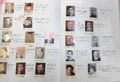 このノートでは,社会の資料集についている人物シールを使って,それぞれの人物が何をしたのかが簡潔にまとめられていました。