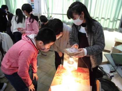 発想力豊かに,太陽の光で豆電球をつけている子もいました。