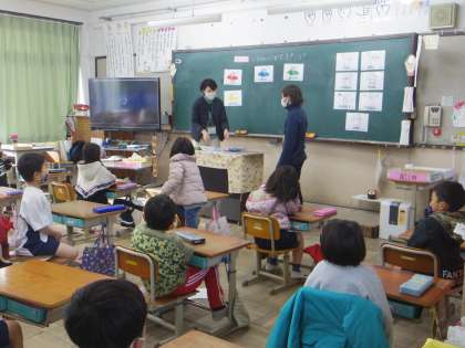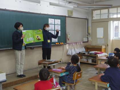 ALTの先生が話す言葉をしっかり聞いたり,ゲームをしたりしながら楽しく学んでいます。「Beautiful Butterfly」という絵本を読んでいただきました!英語の絵本が珍しいのか,子どもたちは興味津々で見ていました。