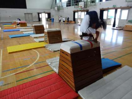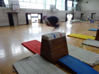 足を上げて,台の上での前転,目線の位置など開脚跳びよりもすることが多く,頭では分かっているけど体が言うことを聞いてくれません。一つ一つ整理するのが大変です。