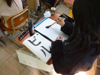 日頃,鉛筆では意識せずに書いているカタカナも筆になると思ったように書けないことがほとんどで,難しいです。一人一人がお手本をよく見て,「曲がり」「おれ」意識しながら集中して仕上げました。