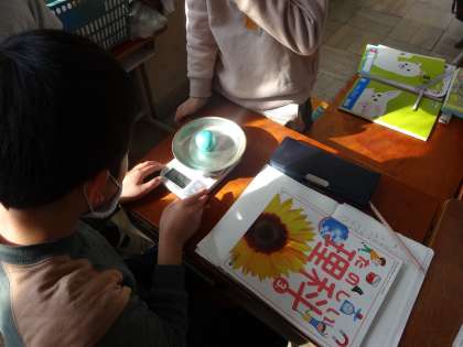 すると・・・「あれっ形を変えると重さ変わったよ。」と言う声。それに続けて「本当だ!形を変えると重さ変わるんだ。」と友だちが続きます。おかしいなと思った別の友達が,周りを探すと「床に落ちてるよ。」そして,量りに乗せると「あっ!重さ変わらないんだ。」きっとこの3人は,この実験で実感の伴った学習になったはずで,忘れられない実験になったことでしょう。