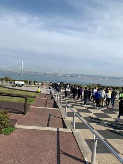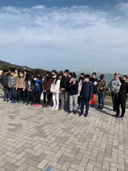 明石海峡大橋や海をバックに、クラス写真を撮りました。