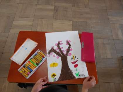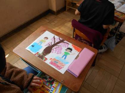 図画工作で,おはなみスケッチをしました。春をイメージした花や生き物を描きました。最近は,暖かくなり春らしさが感じられるようになりました。クレヨンを使って色鮮やかな作品が出来上がりましたね♪