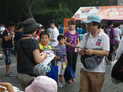 先週の土曜日、西京極競技場で京都サンガの試合に来られていた方々に人権啓発グッズを配りました。京都地方法務局からの依頼で、13組の親子が応募してくださいました。あいにく夕方から雨が降り、悪い条件でしたが、「友達を大切にしましょう」など声かけをしてサンガのノートやベンチシートを配っていました。