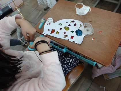 いよいよセロハンを貼り,作品完成が近づいてきました。