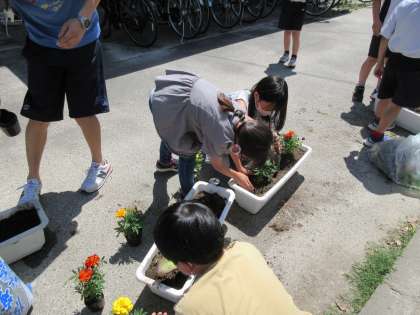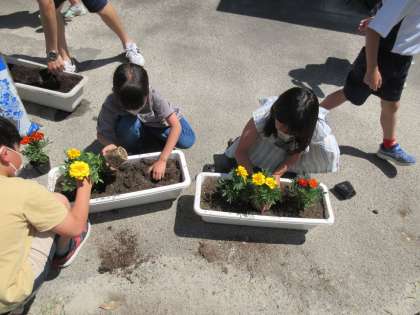 花いっぱい運動で,中庭のプランターにマリーゴールドを植えました。