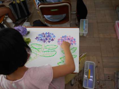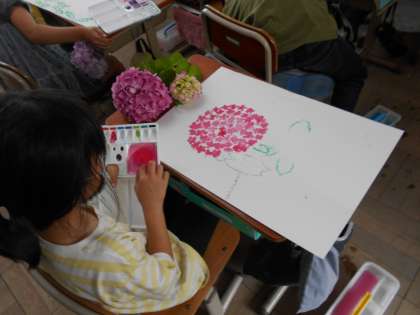 自分の好きなアジサイを選び,画用紙の色も藍色もしくは白から選んで描きました。