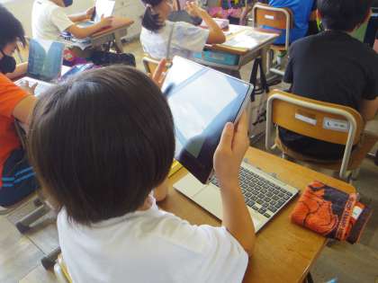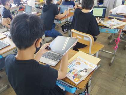 外国語の学習では,タブレットを使って,自分の声を録音しました。