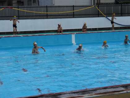 広いプールにみんな興奮気味でした。シャワーの浴び方,入水の仕方,まねっこ遊びを学習しました。