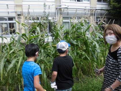 1学期から大切に育てたトウモロコシも,夏休みの間にすっかり大きくなりました。