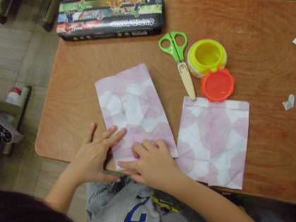 来年の4月に入学する1年生に,朝顔の種のプレゼント用の封筒を,染めた和紙を使って,作ることになりました。お家で収穫した種の中からいい種を選んで封筒に詰めました。染めた柄が上手く出るように工夫してずらして封筒を作っている児童もいましたよ。