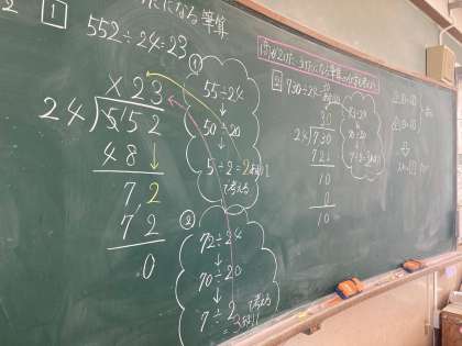 算数科「2けたでわるわり算の筆算」の学習の様子です。