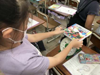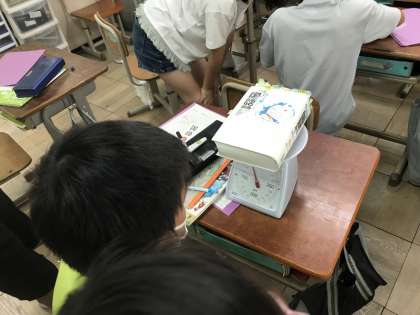 そして,実際に自分の水筒や筆箱,辞書などの重さを量りました。