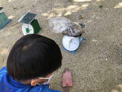 1キログラムの砂を袋に詰め込み,量感を学習する時間でした。