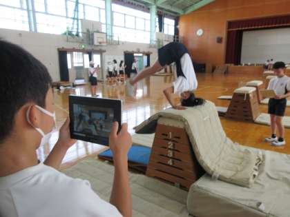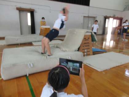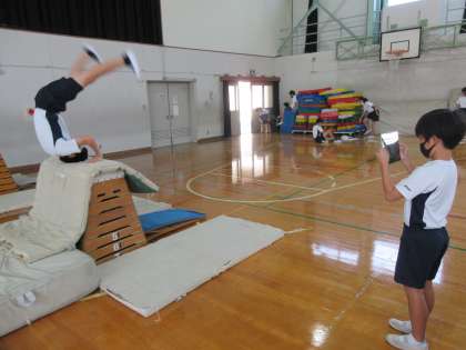 ねらい2を行う中で,ペアで動画を撮り合い,アドバイスをしていました。