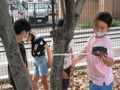 巻尺のいいところは,丸いものも測ることができると子どもたちから出たので,早速,木の幹を図りました。