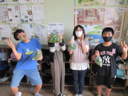 たくさんのピーマンを抱えて教室に帰ってきた園芸委員さんです。