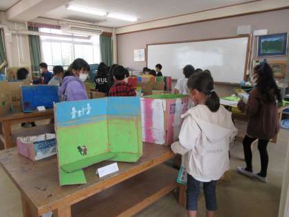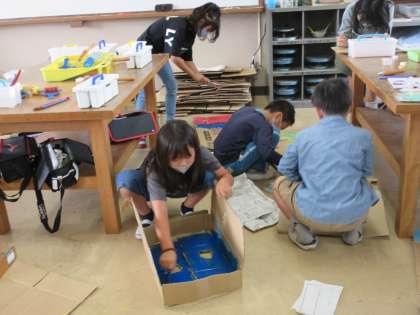 図工科の「ペタパタ開くと」の学習で,段ボールを切り開いてそこから見えるものや一人ひとりが感じたことを絵の具を使って表現しました。