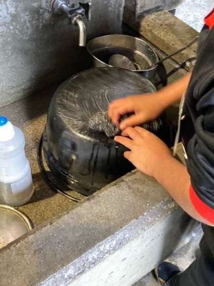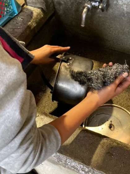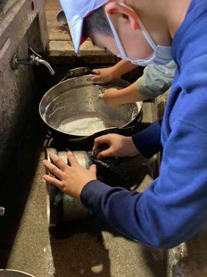 すすの着いたお鍋を洗うのは一苦労。けれど来たときよりも美しくを合言葉に頑張ります。