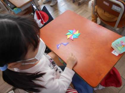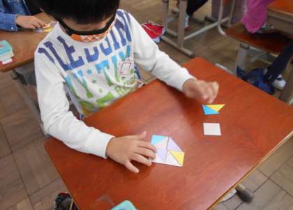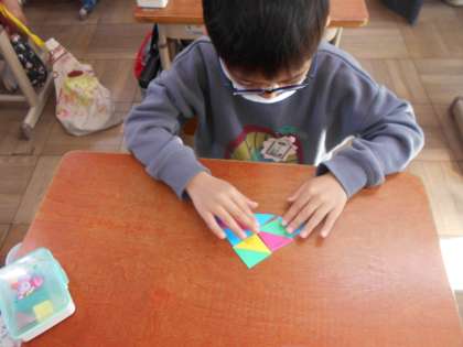 色板を並べて,風車の形を作ったり,魚の形を作ったりしました。