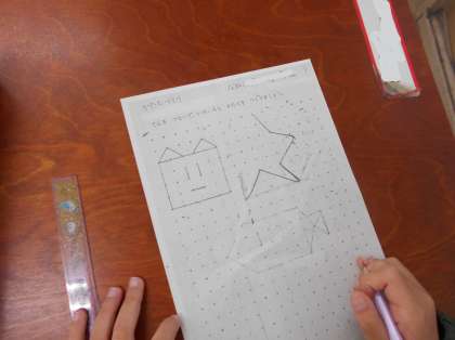 「かたちづくり」の学習では,点と点を繋いで形を作る活動もしました。