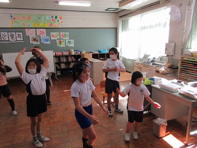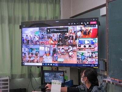 おちたおちたゲームでは,他校の友だちの「おにぎり」「かみなり」等の言葉を聞いて,食べるふりをしたり,おなかをおさえたりして楽しみました。