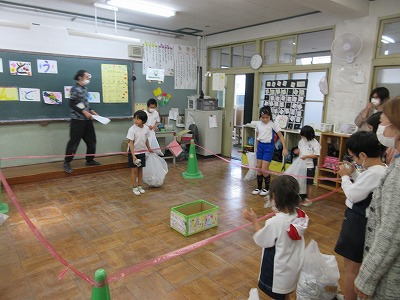 玉入れでは,新聞紙が10校で箱に何個入るかを頑張りました。10校の合計が800個を超えてみんな喜んでいました。