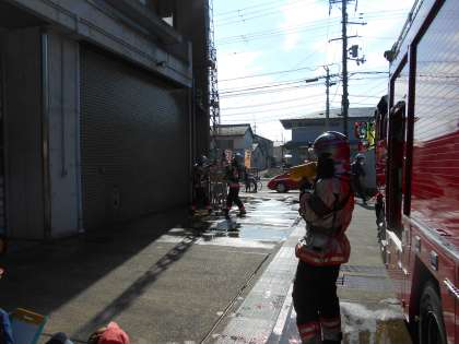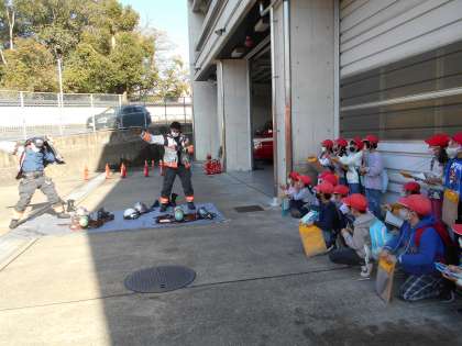 消防士さんは1分以内に服を着替え消防車に乗り込むことを目標に日々訓練に取り組んでおられることを聞き,実際に服を着られ,消防車に乗り込むところを見せて頂きました。