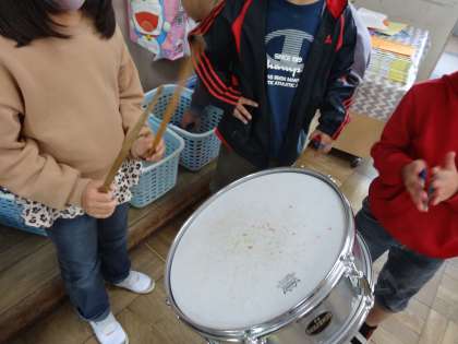 2人組になって,がっきでおはなしをしました。2つのリズムを組み合わせて鳴らします。友だちは,そのリズムに返していきます。