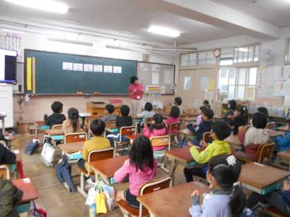英語であいさつをしました。[Hello.][Thank you.]など,楽しみながら会話をすることができました。