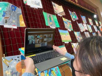 造形展鑑賞に行きました。何人かの子どもにタブレット端末も持っていってもらい,自宅待機の子どもはオンライン鑑賞をしました。