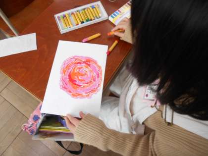 先週と今週の図工の学習では,お祝いの花を描きました。6年生の卒業と新1年生の入学をお祝いする気持ちを込めて作りました。みんなのお花を集めて花束にしました!