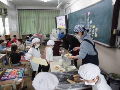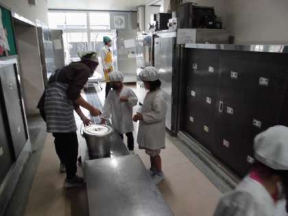 初めてエプロンを着て,給食の配膳。