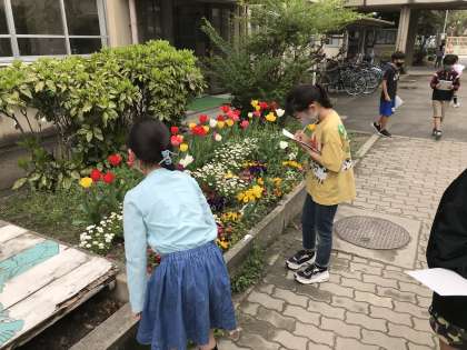 春の生物の様子を,実際に中庭へ調べに行きました。