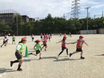 前を向いて、走りながらもらう、パスをする児童が多く、白熱しています!